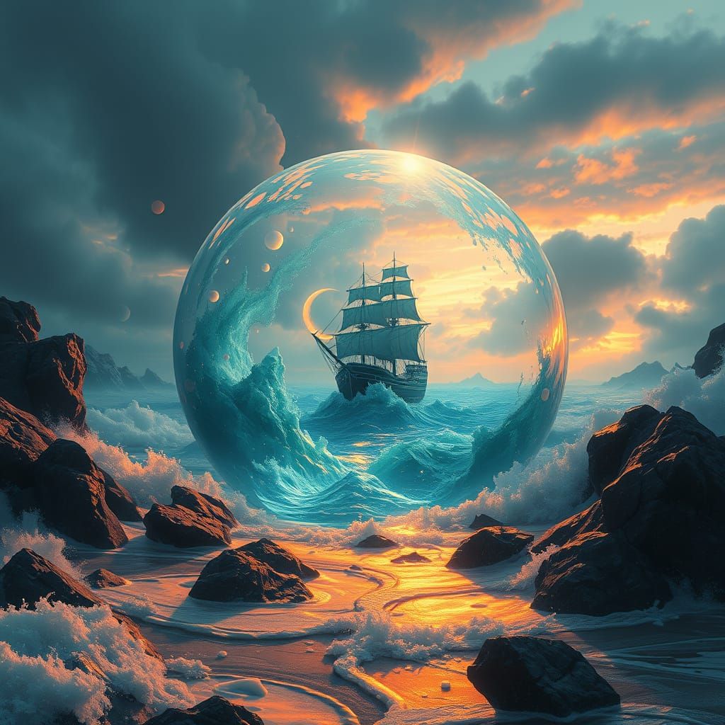 This image shows a vibrant, high-detail scene of a glass orb connecting with the land, set amidst a stormy ocean with a ship in the background, created in a dynamic, triadic color palette style reminiscent of Alphonse Mucha's ornate art