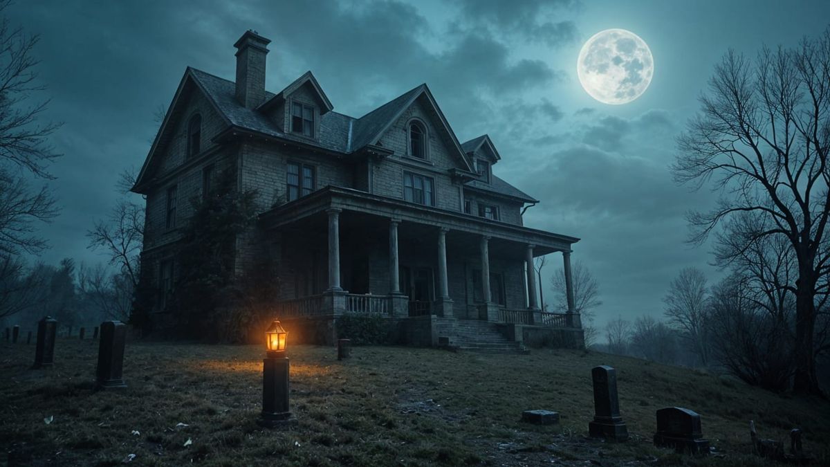 A cinematic image of a derelict mansion atop a hill, complete with a small graveyard. Mist hangs low, bats circle under a full moon, and a cloaked figure holds a lantern.