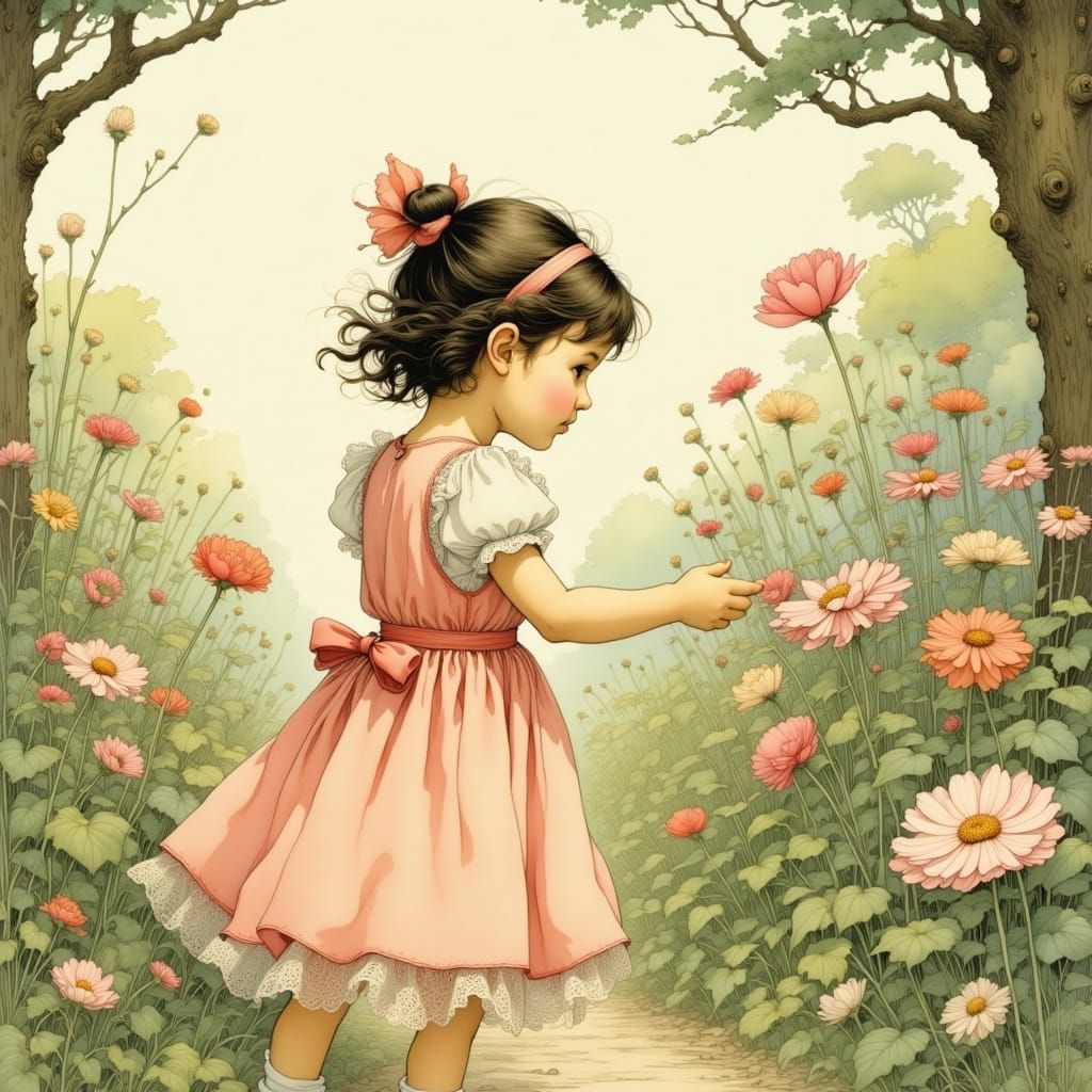 This image shows a toddler girl with curly hair wearing a lace-trimmed pastel pink dress, chasing bubbles in a sunlit garden. The art style evokes vintage children's book illustrations.
