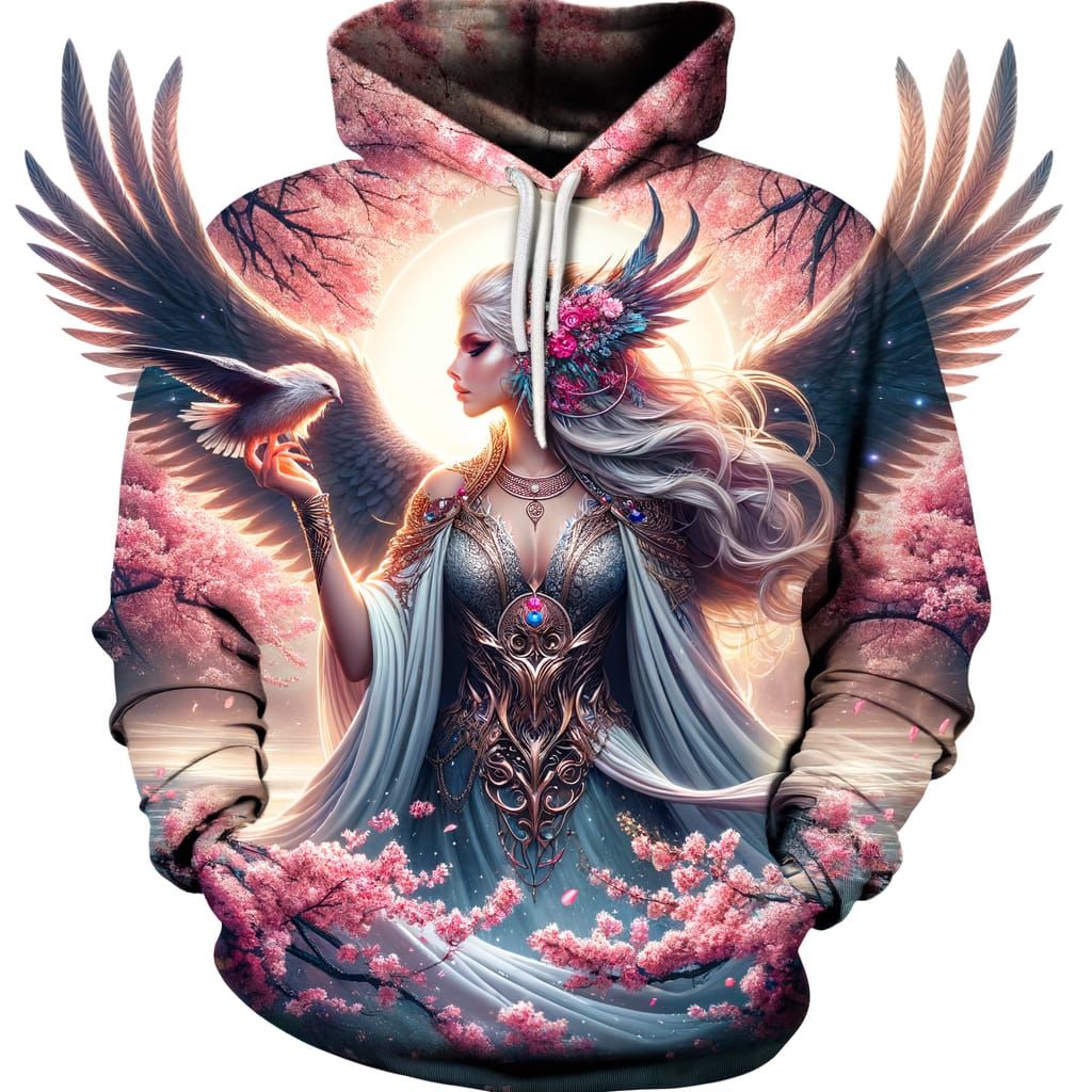 This image shows Freyja, the Norse goddess of love and beauty, wearing a falcon cloak and holding the Brísingamen necklace. Cherry blossoms surround her in this 8k resolution digital artwork.