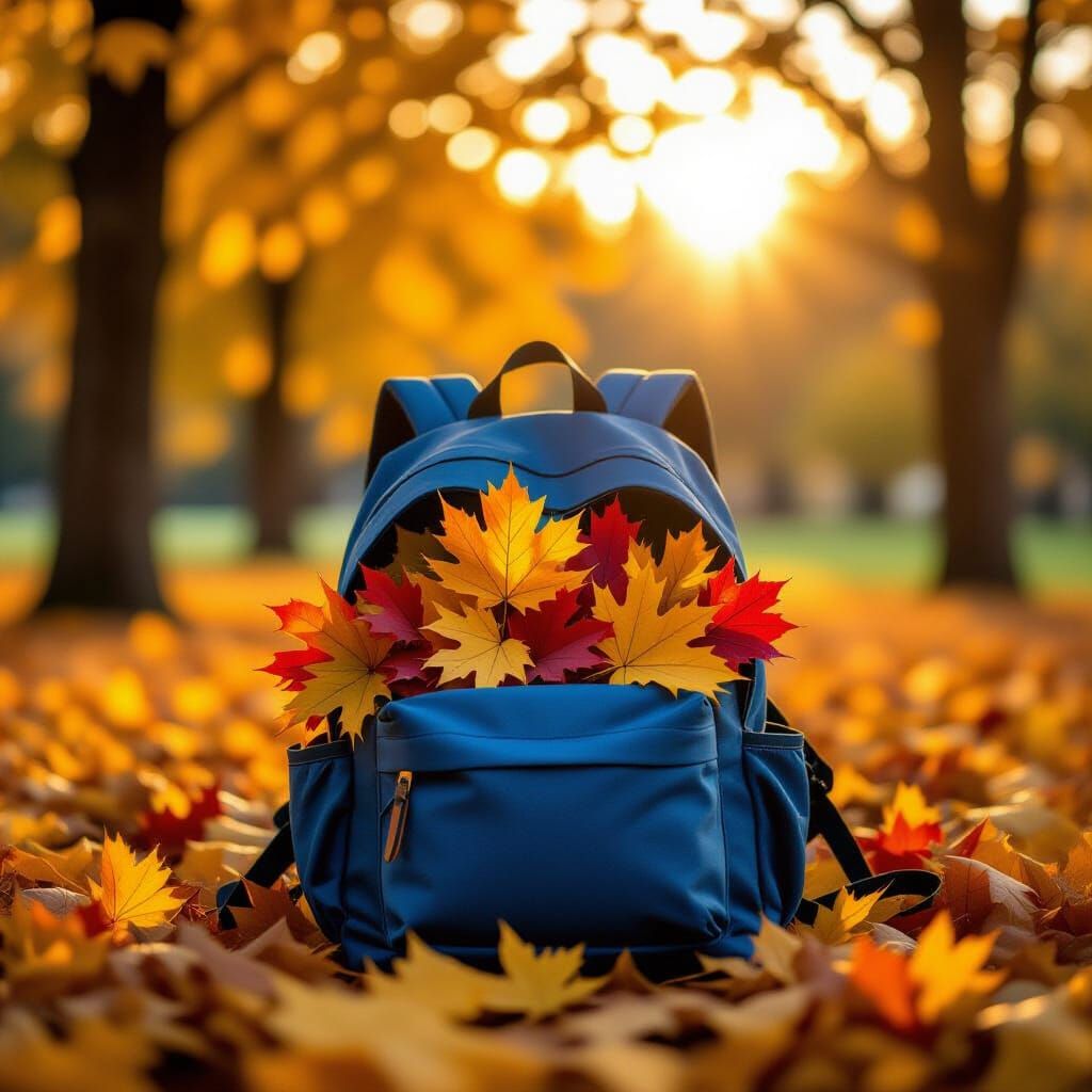 This image shows an open blue backpack brimming with vibrant autumn leaves in a park. Dappled sunlight illuminates the scene, captured with professional photography techniques for exceptional detail.