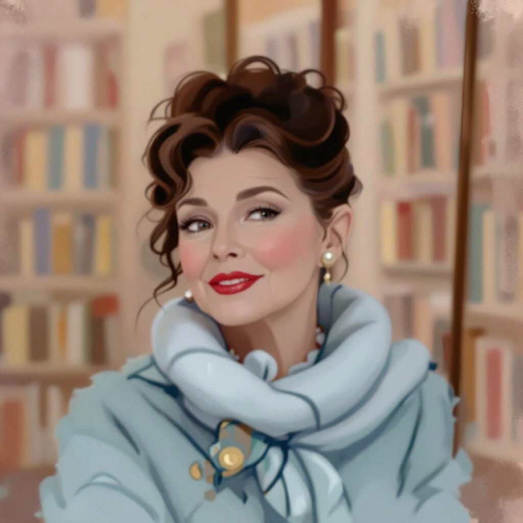 This image features an elegant elderly woman in a hat, sipping tea in a cozy bookstore café. Rendered in a charming illustrative style with warm lighting and rich textures.