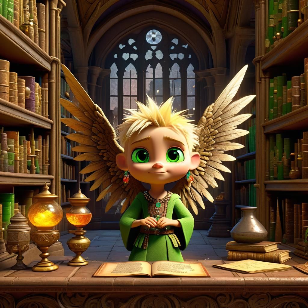 A striking digital art image of a punk pixie with green eyes and spiky blonde hair in a magical library. The pixie is wearing earthy tones with jewelry, rendered as 3D digital art.