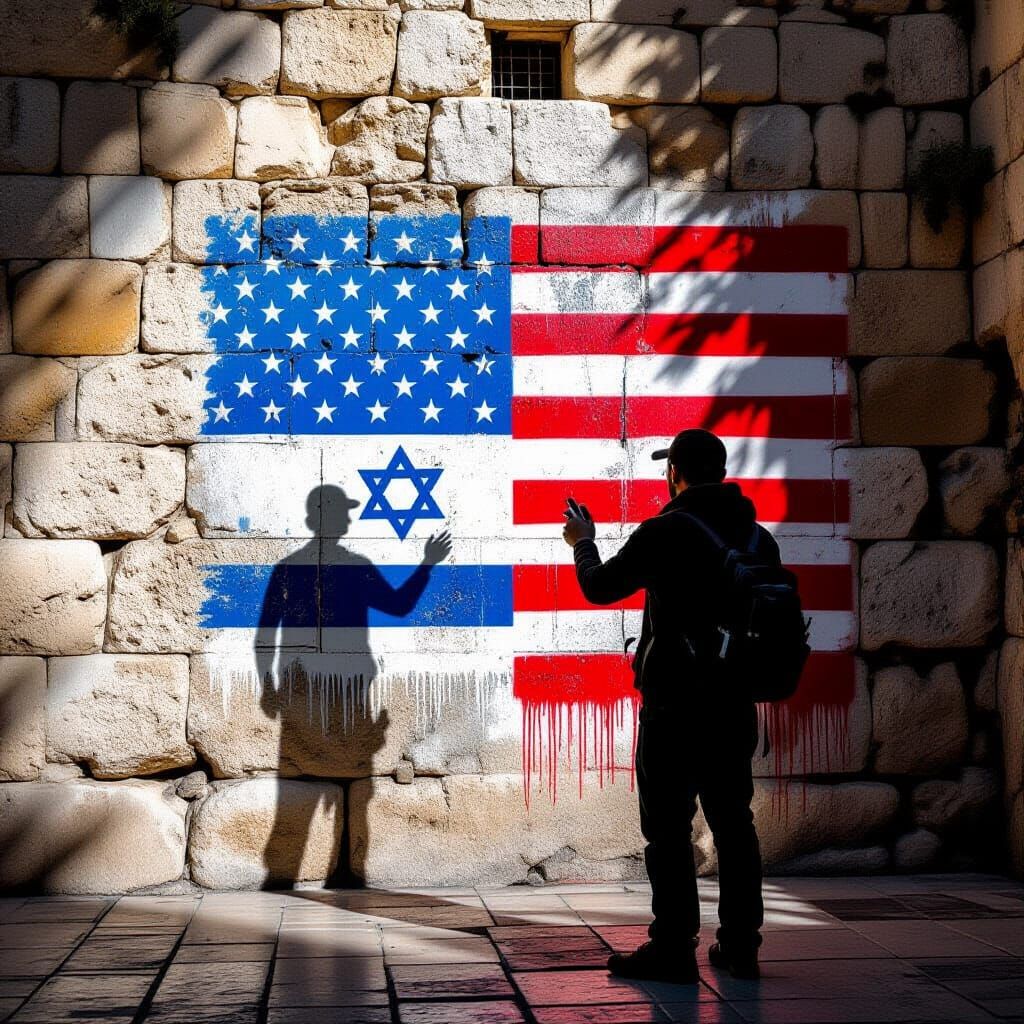 This image shows a man spray-painting a wall of Jerusalem stones. The graffiti features a human shadow, half American flag, half Israeli flag, rendered in a gritty urban art style with dramatic lighting.