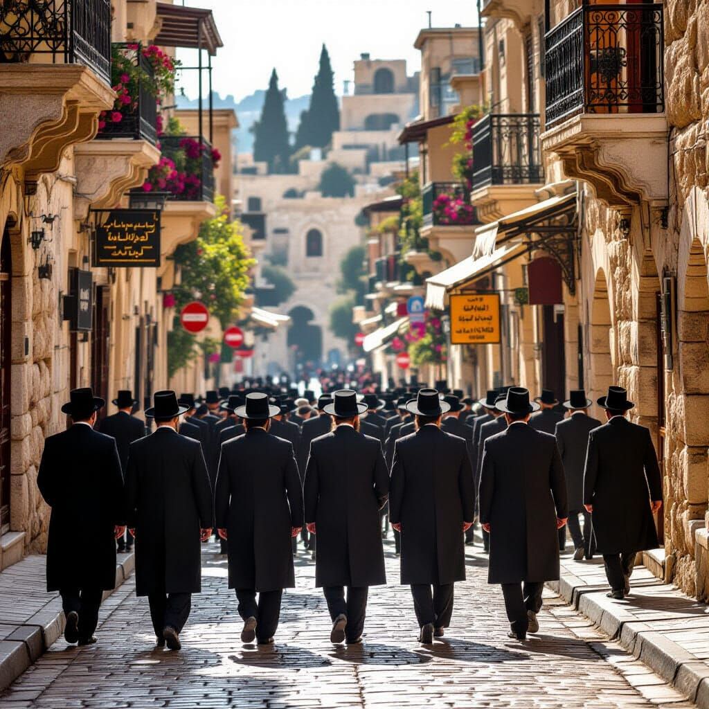 This image depicts ultra-Orthodox men in traditional attire walking through Jerusalem's Mea Shearim. Realistic documentary style with warm, earthy tones and dramatic shadows.