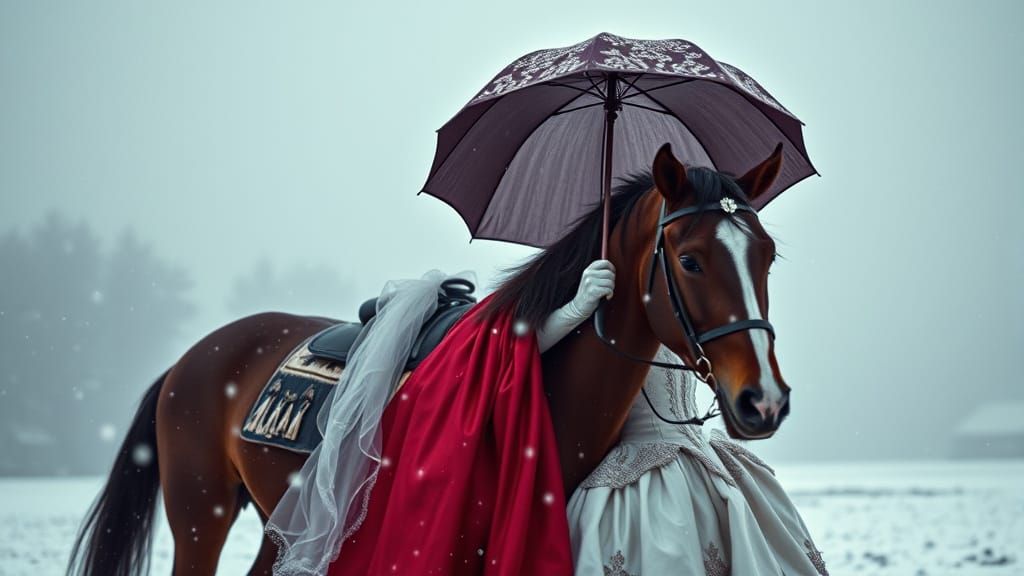 This image depicts a charming Victorian couple, Victor and Emily, embarking on a snowy journey. They are accompanied by a horse, a large umbrella, and a piano, symbolizing their love and travel.