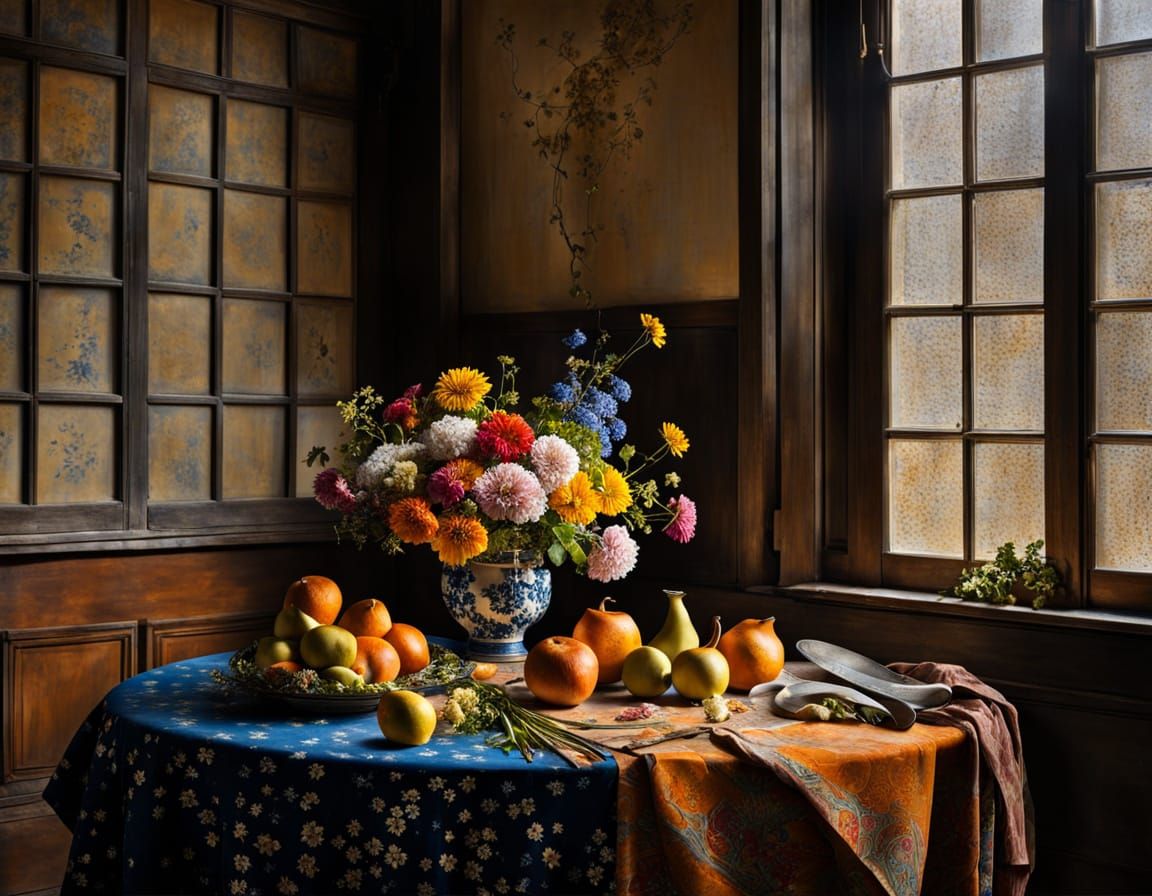 % && Old butcher Table by a large bright window bundles of arranged Dry flowers golden and delft blue in a dimpled copper bucket whitewashed walls contre-jour god rays radiant rays Jackson Pollock Vermeer striking hyper real painting atmospherics