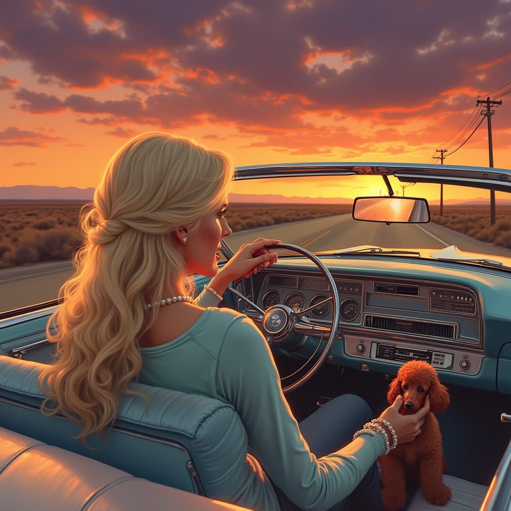 This image shows a platinum blonde woman driving a vintage Cadillac Eldorado down Route 66. The scene evokes Mid-century Americana with vibrant colors and a sense of open road freedom, capturing gritty realism.