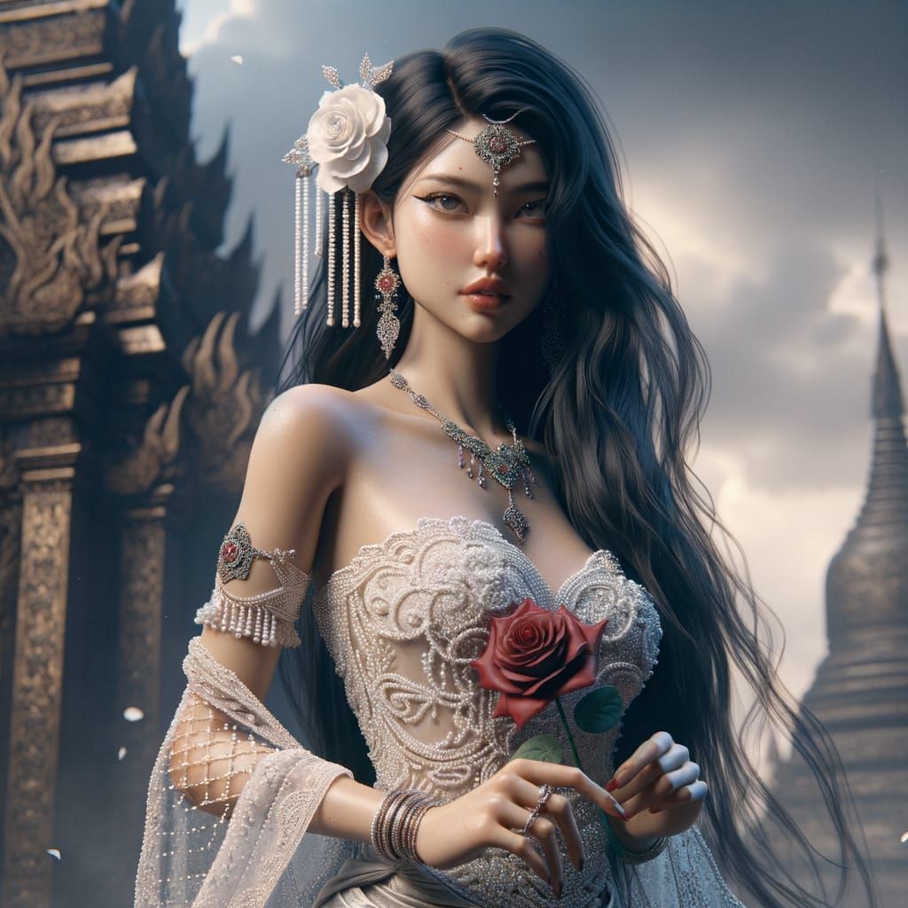 A striking picture of a young Burmese woman in traditional wedding attire, holding a red rose. The image, reminiscent of fantasy concept art, features intricate details, complementary colors, and atmospheric depth, rendered as a detailed matte painting.