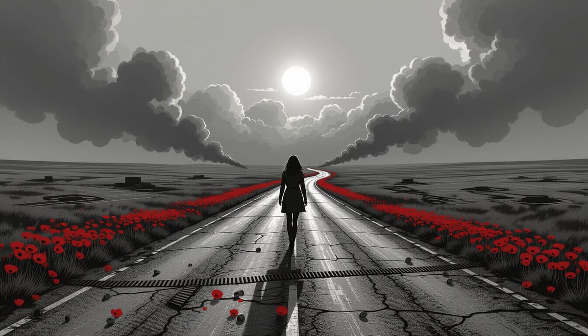 This image shows a lone woman walking a cracked road toward the horizon in a desolate landscape. Red poppies grow in the cracks, under a somber sky, in a gritty black and white style.