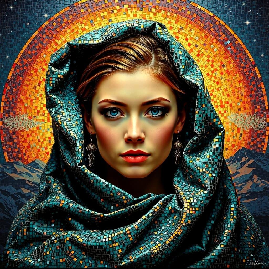 A mosaic artwork of a woman with iridescent colors rippling across her skin. The colorful tiles create a stunning visual effect against a starry night sky in a maximalist style.