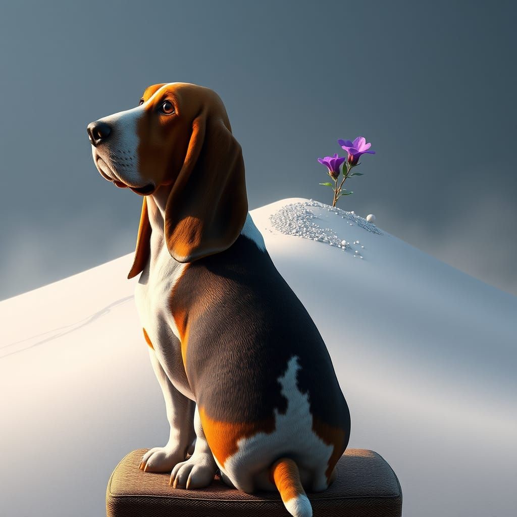 A Basset hound sits on a chair before a fantastical matte painting of a sand and gravel hill with a single purple flower. The scene features deep colors and intricate detail.