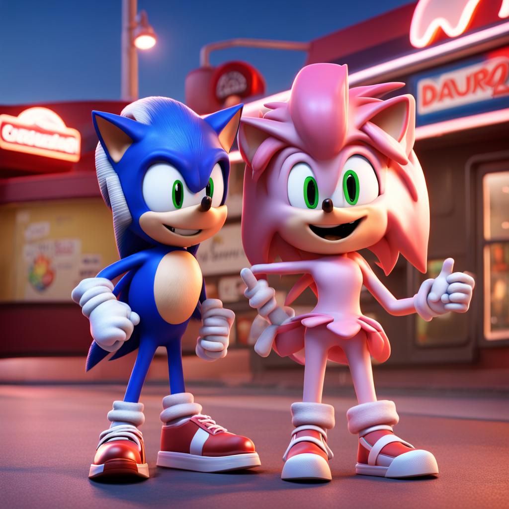 This image shows Sonic the Hedgehog and Amy Rose at Dairy Queen. The characters are rendered as 3D digital art with bright colors and a radial gradient background, reminiscent of Pixar or Disney concept art.