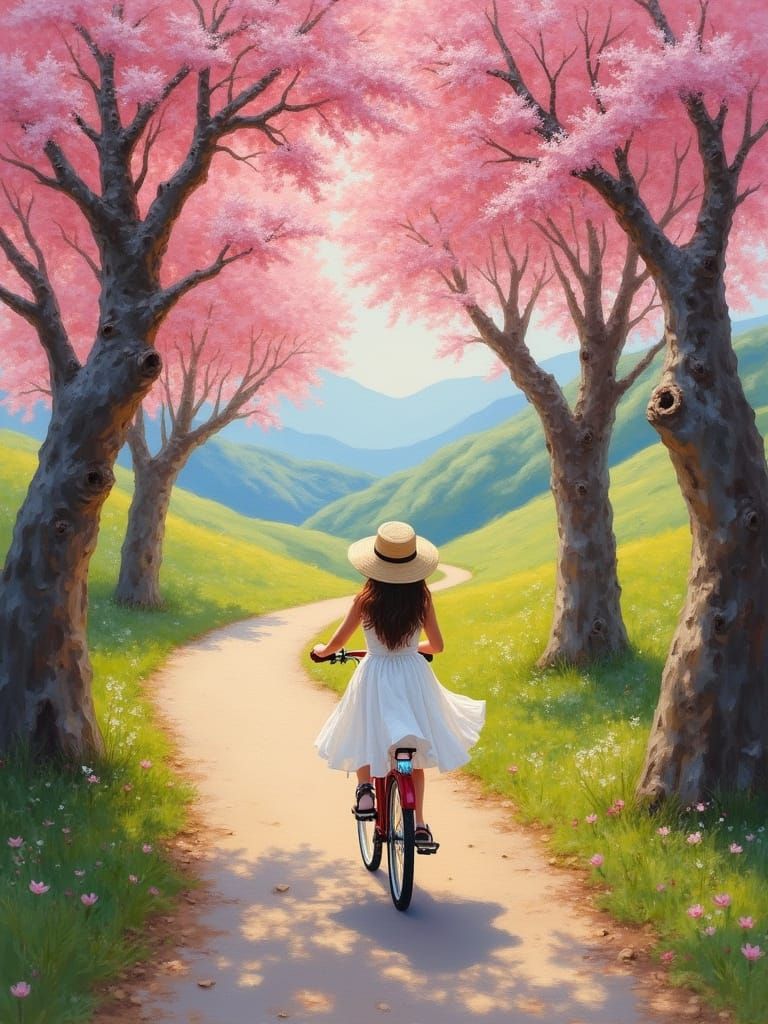 A breathtaking impasto oil painting of a girl cycling along a serene cherry blossom path, captured from behind with thick, expressive brushstrokes. The textured oil paint brings the scene to life as delicate pink petals swirl through the air, contrasting against the rich, layered hues of the cherry trees ...