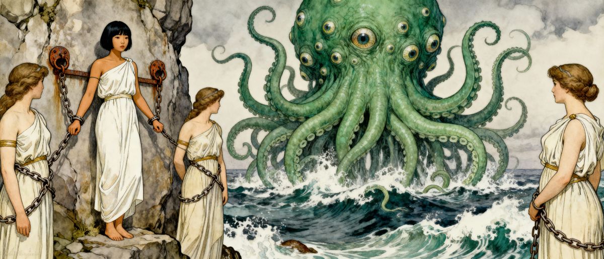 This image shows a Korean woman in a Greek robe chained to a cliff, facing a monstrous sea creature, in a detailed, gothic illustration style with muted colors and soft lighting.