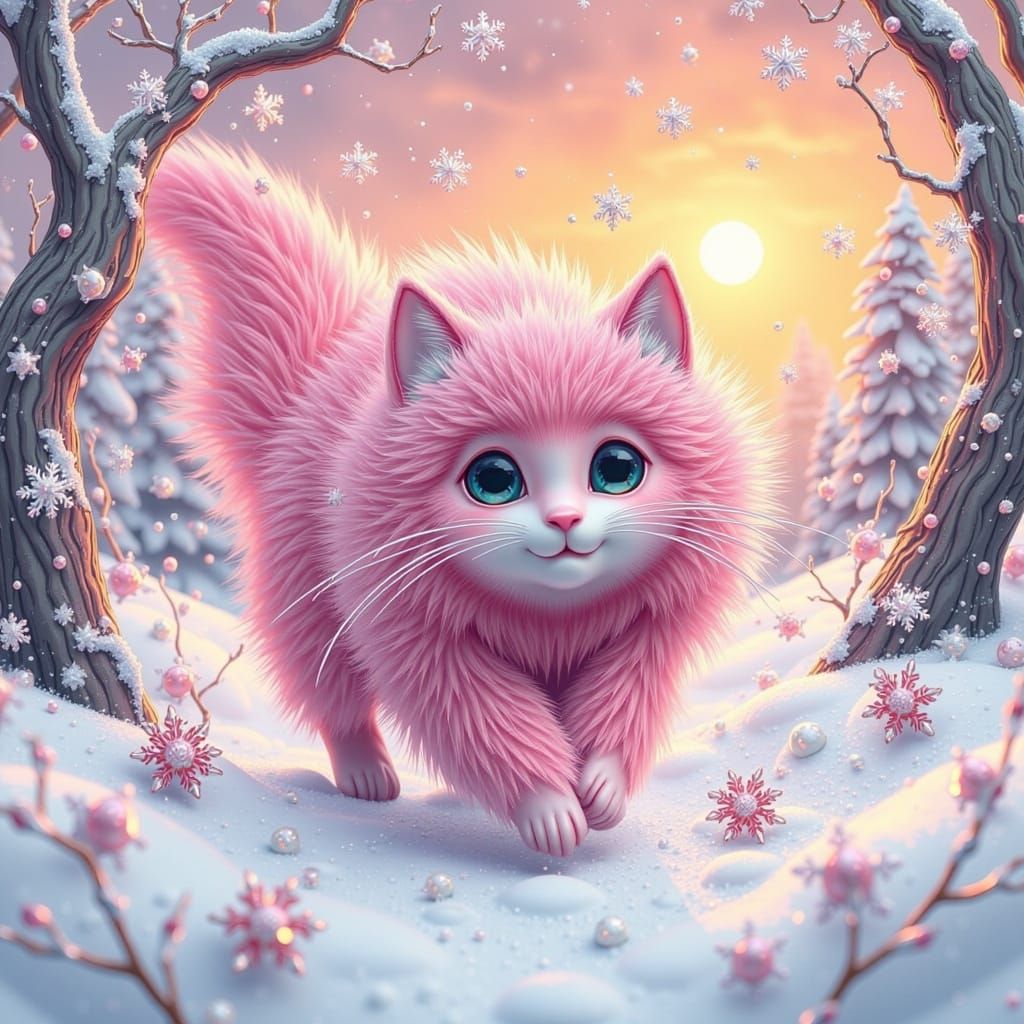 This image shows a fluffy pink cat playing in the snow under a sunset. The artwork is reminiscent of papercuts, with delicate snowflakes and intricate layering.