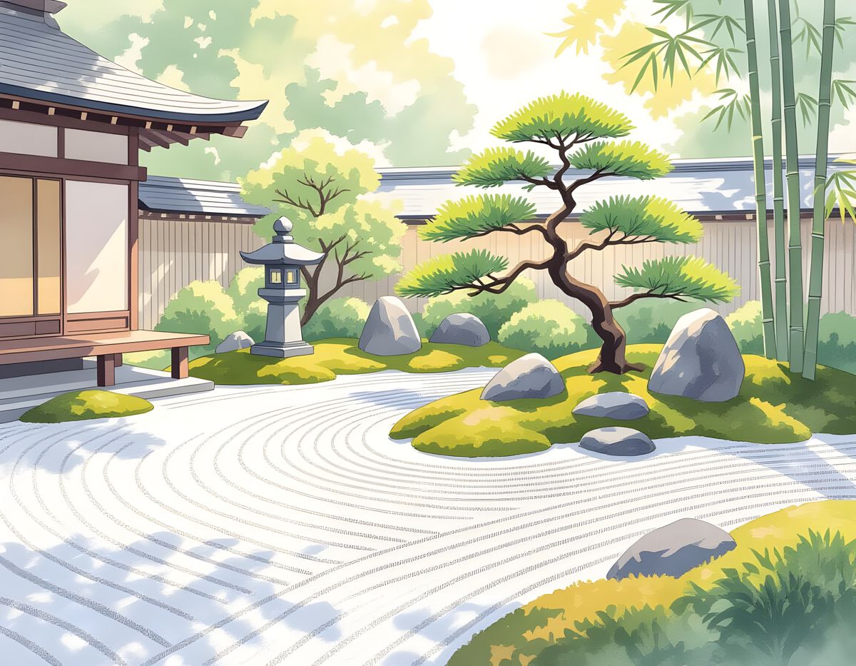 A serene Japanese Zen garden featuring raked gravel, mossy stones, and an ancient bonsai tree. Rendered in a soft watercolor style with pastel colors.