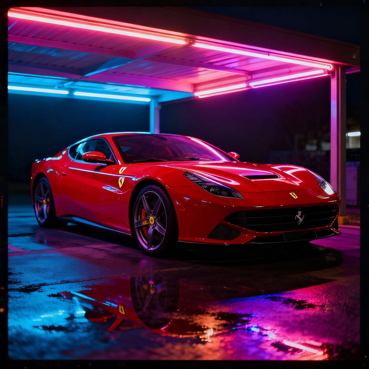 This image shows a vibrant red Ferrari illuminated by vivid neon lights, captured in a dramatic, atmospheric cinematic film style with realistic film grain and lighting.