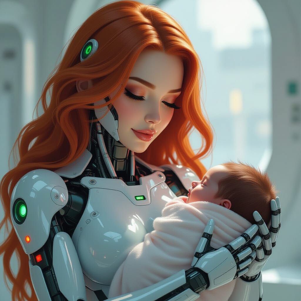 This hyper-detailed digital painting shows a futuristic cyborg midwife with red hair and green eyes, tenderly holding a swaddled baby. The artwork features a shiny, female form.