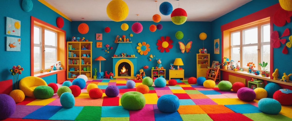 This image shows a vibrant and colorful needlefelt world, evoking a childish and comforting atmosphere. The scene resembles a cozy cradle room, filled with joy and warmth.