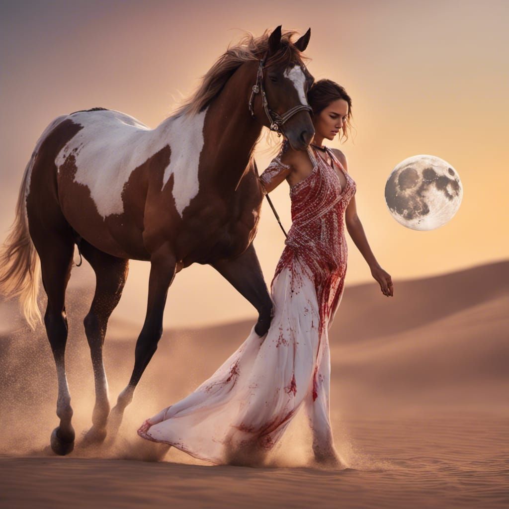 This image shows a desert goddess walking with her Arabian mare through the sands at sunset. The image is a professional photograph with natural lighting and sharp focus.