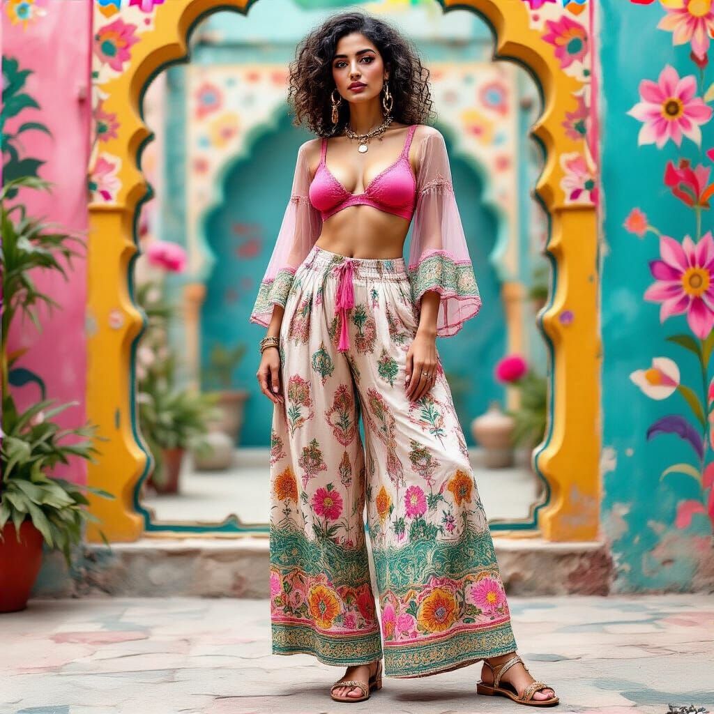 Artistic watercolor with oil, tinting, detail, realistic, full body no angle shot of a slightly pump woman standing in a vibrant urban with a colorful floral mirror walls, dynamic clothes plus eye contact, medium length colored curly hair she wears a pink craft bra, top, sheer poet, sleeves, dynamic ...
