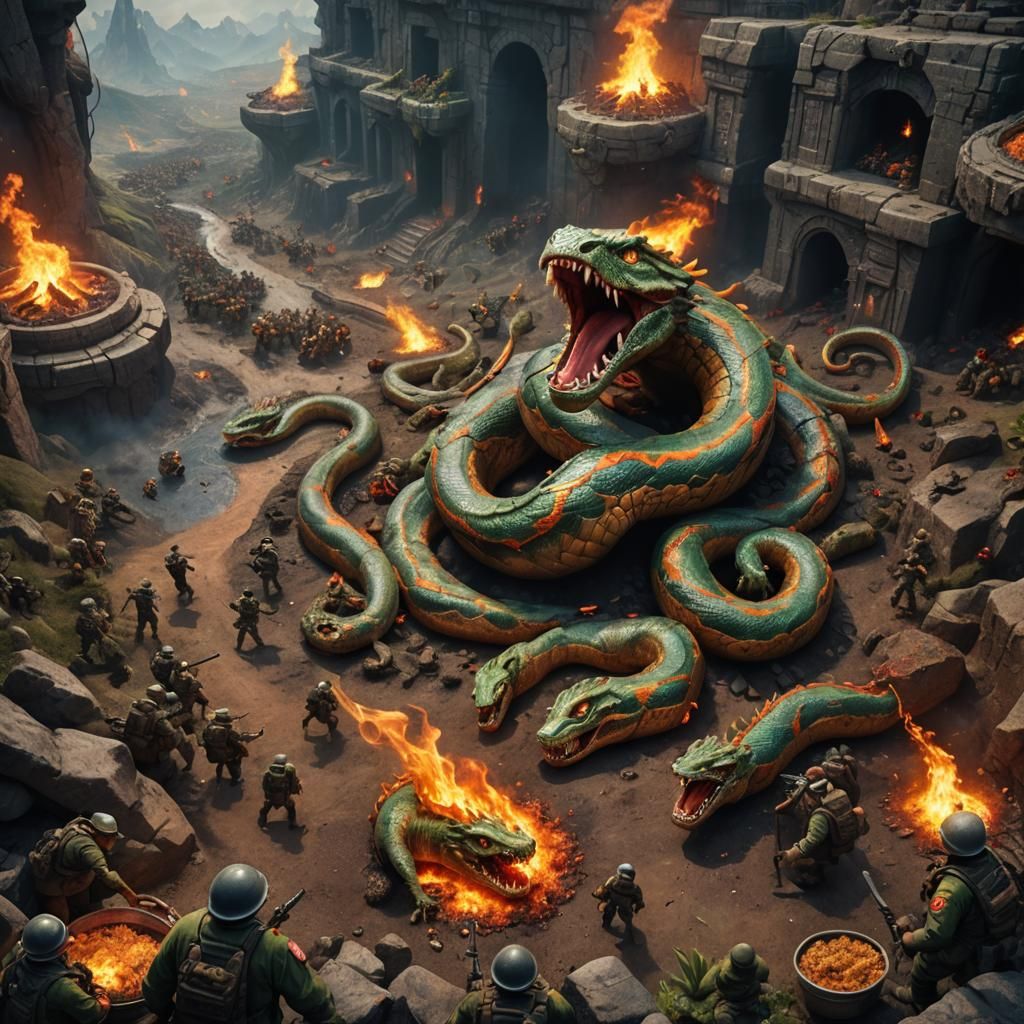 A dramatic movie poster depicting a fiery serpent emerging from the earth to attack soldiers and civilians. The image is rendered in a detailed, colorful, and fantastical style.