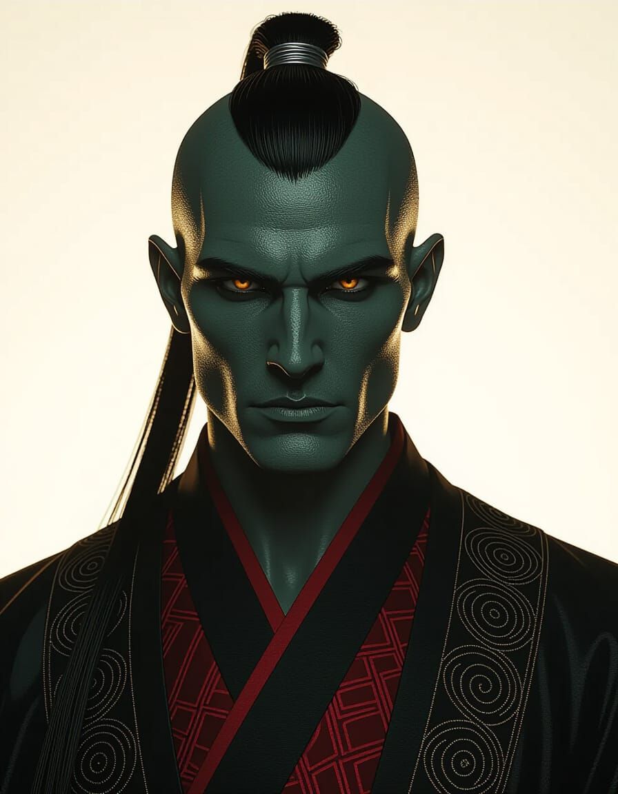 A striking picture of a bald, obsidian-skinned humanoid male with metallic gold eyes. He wears black and crimson robes and a commanding expression, rendered in a photorealistic, urban fantasy style.