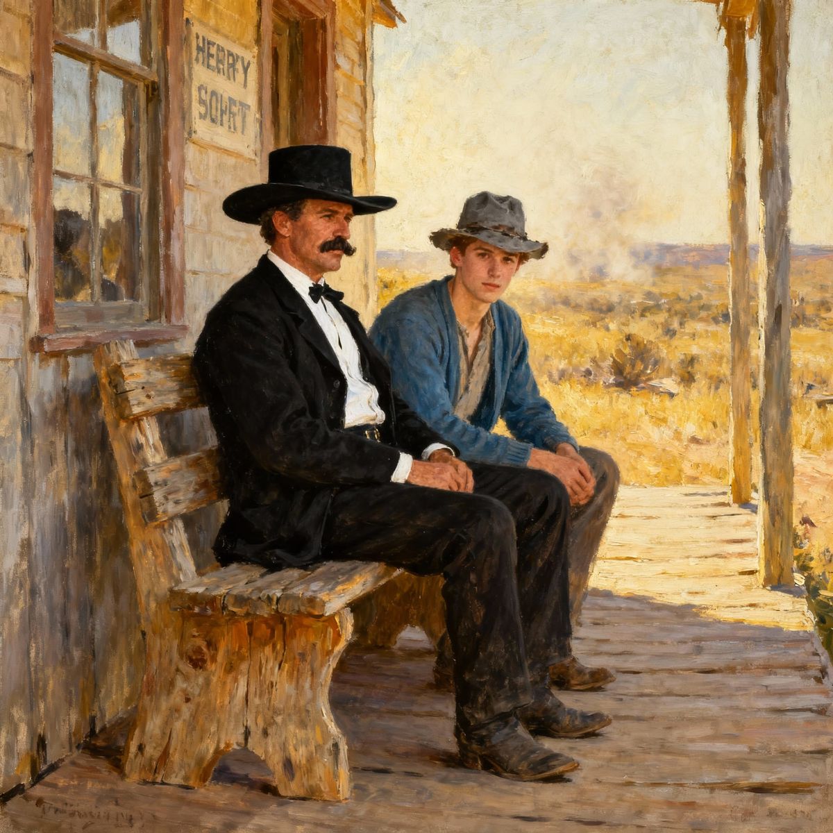 This impressionistic oil painting depicts two men in western attire, seated on a wooden bench outside a sheriff's office in the American Southwest, circa 1880.