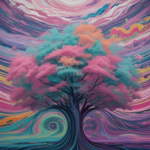 This image depicts a whimsical, candy-colored landscape with lollipop trees and figures adorned with bold, gestural lines. It features swirling, dreamlike textures and a dynamic color palette, rendered in an expressionist splatter art style.