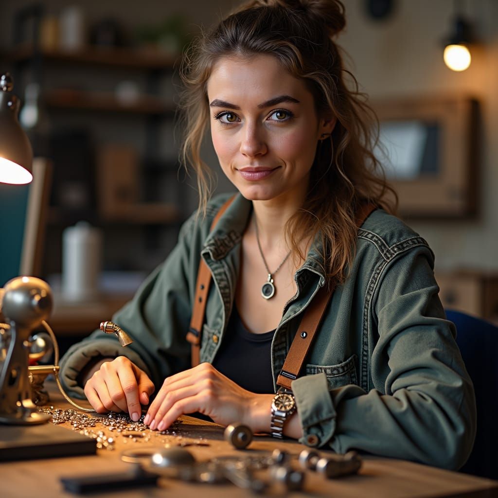 This image shows a confident woman in adventurer attire, working with bronze gears and steam cylinders in a workshop filled with clockwork oscillators and copper coils. The illustration is in a steampunk style.
