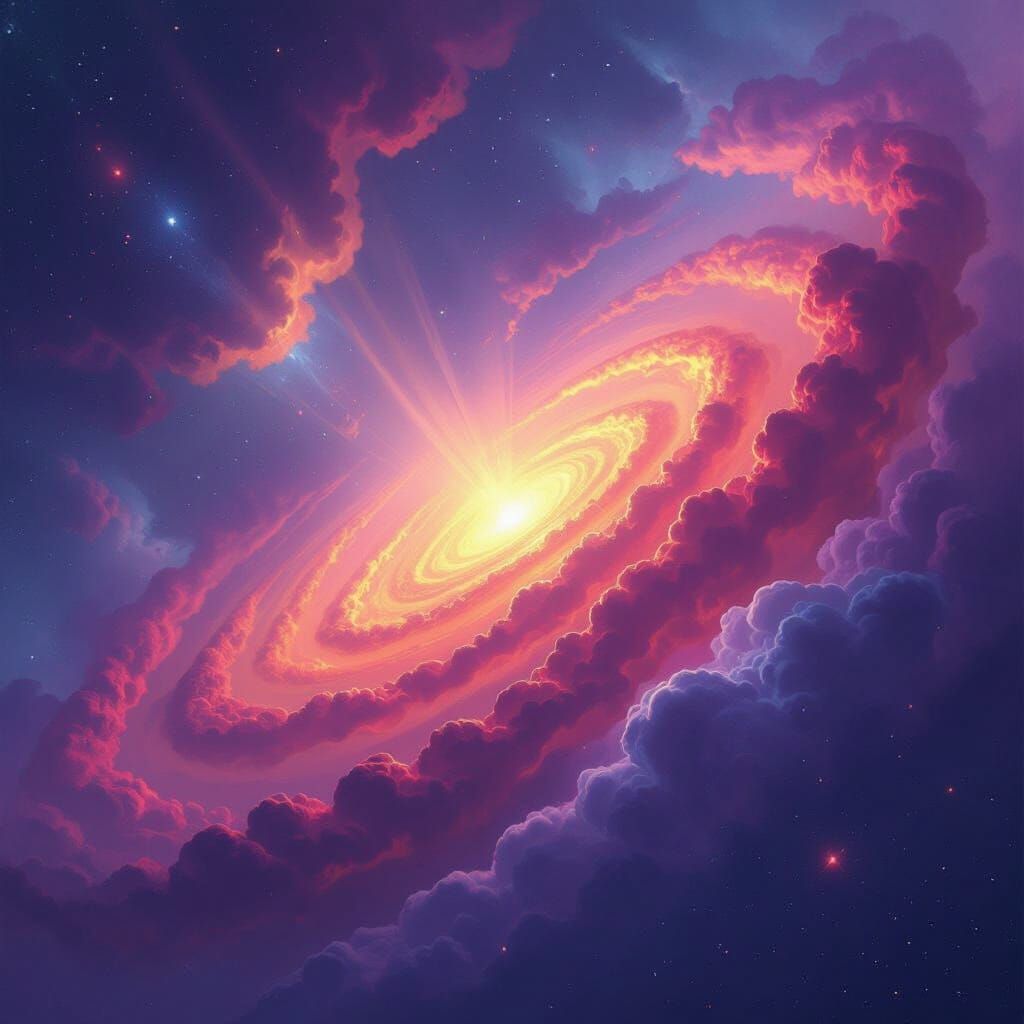 A vibrant swirling galaxy of purple, red, white, and yellow gas clouds. The cosmic landscape is rendered with expressive brushstrokes and a neon-lit aesthetic.