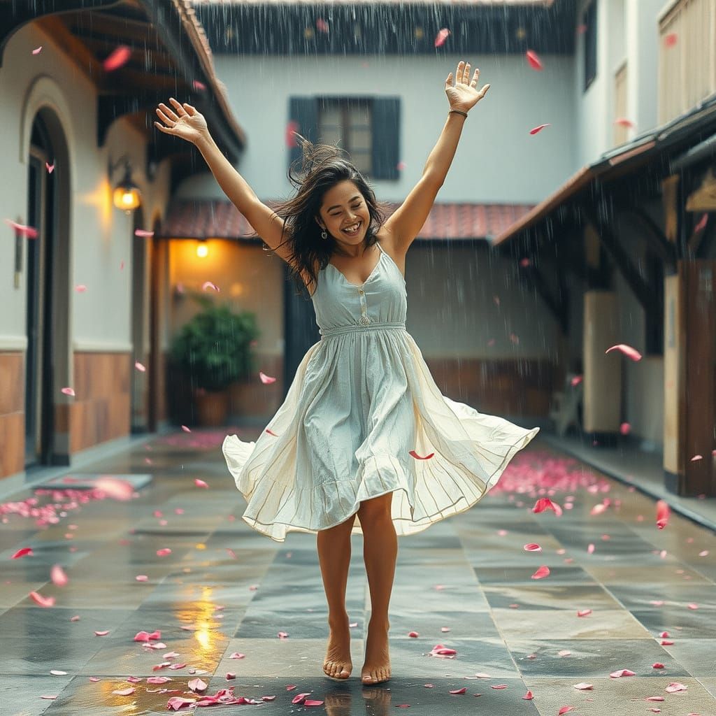 A vintage-style image of a woman dancing in the rain. The watercolor and alcohol ink sketch evokes nostalgia with desaturated colors, light leaks and film grain, capturing a joyful, cinematic moment.