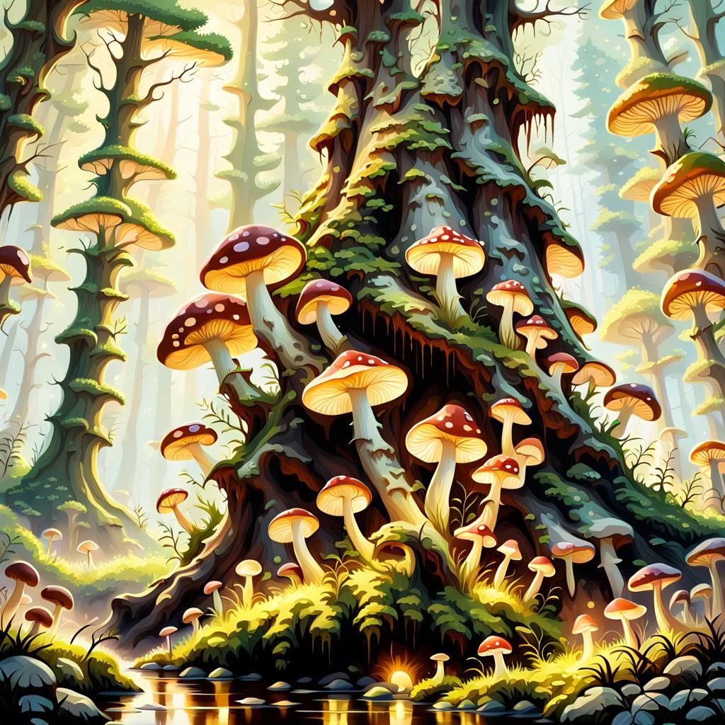 A photorealistic image of mushrooms and toads in a gothic forest glade. Soft light filters through the canopy, illuminating detailed textures and suggestive mist in an ethereal fantasy scene with hyperrealism.