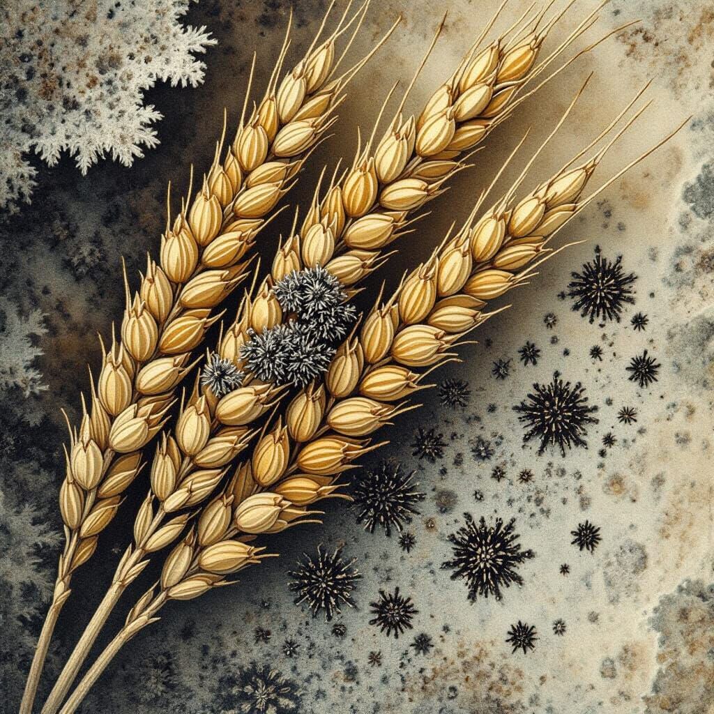 This image depicts toxic, moldy grains with dark spores in a Victorian-era botanical illustration style. It features intricate details, subtle textures, and muted earthy tones, creating an eerie, haunting atmosphere.