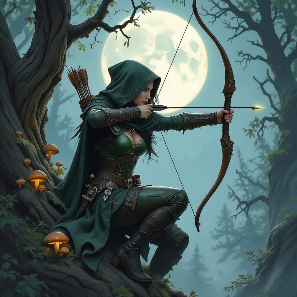 A moonlit scene of an elf rogue in a forest. She is perched in an oak tree, wearing green leather armor and wielding a longbow in muted earthy tones, reminiscent of fantasy art.