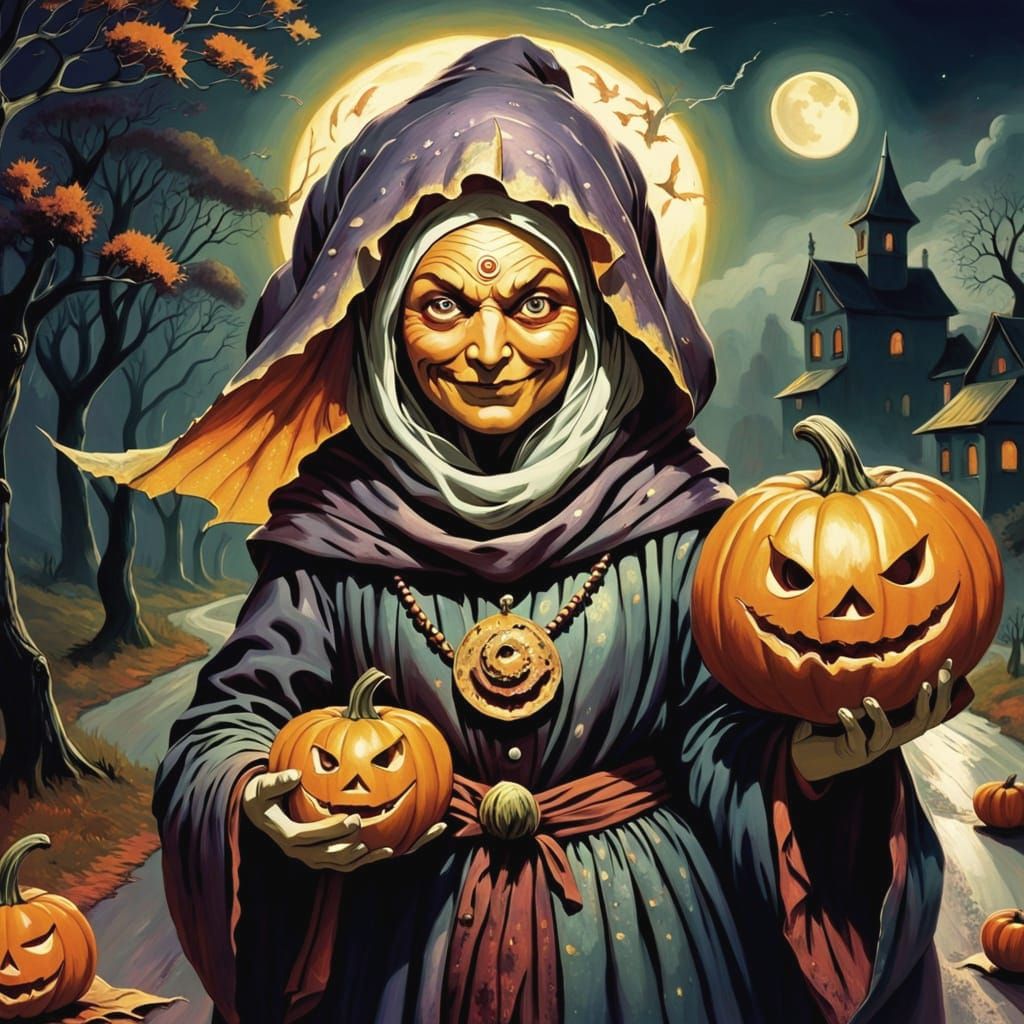 This digital painting depicts a surreal scene with a pumpkin on a Polynesian carriage under a punk, star-filled sky. Ethereal glow and deep purples/reds create a dreamlike atmosphere.