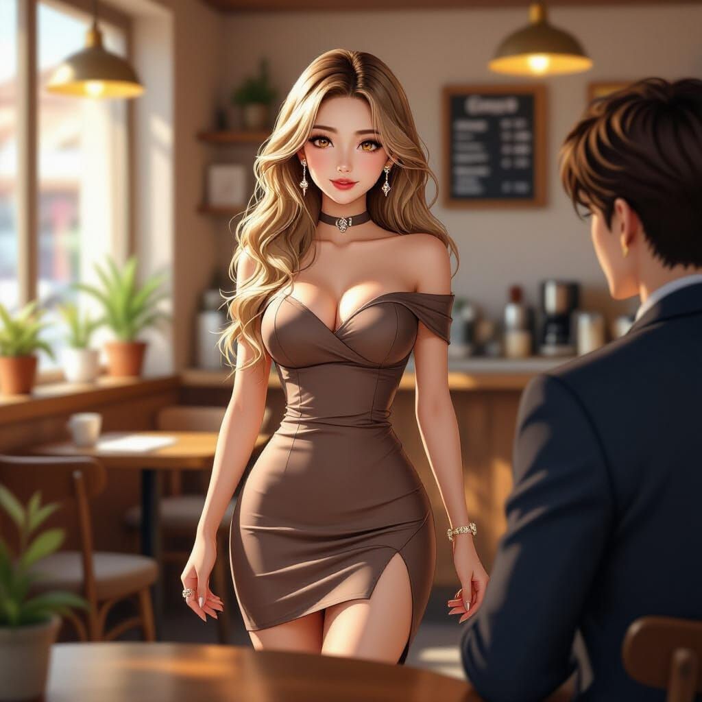 This image shows a beautiful Chinese woman in a coffee shop, created as 3D rendered anime art. The semi-realistic rendering captures her subtle expression and fashionable attire in cinematic lighting.