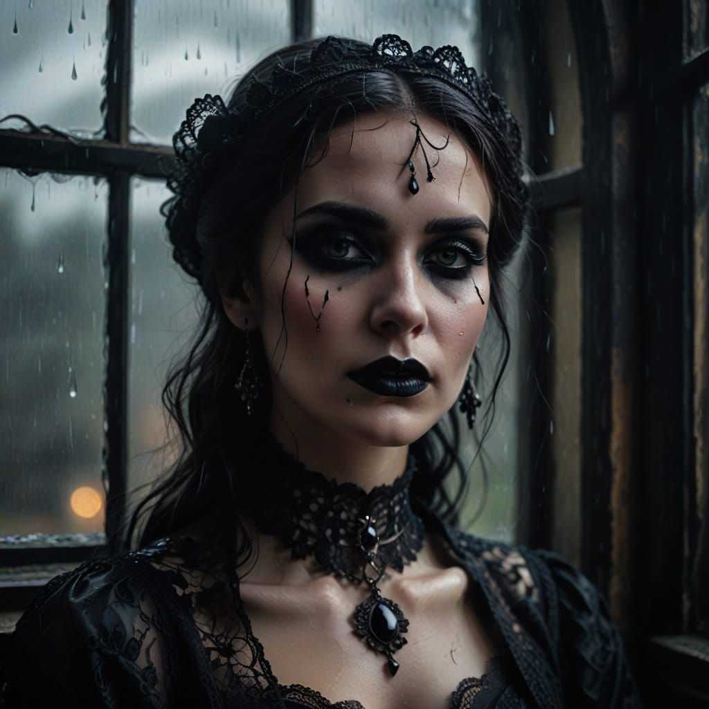 A striking portrait of a gothic woman with dark makeup near a rainy window. The image evokes dark romanticism through soft focus, shadows, and high contrast in a baroque aesthetic.