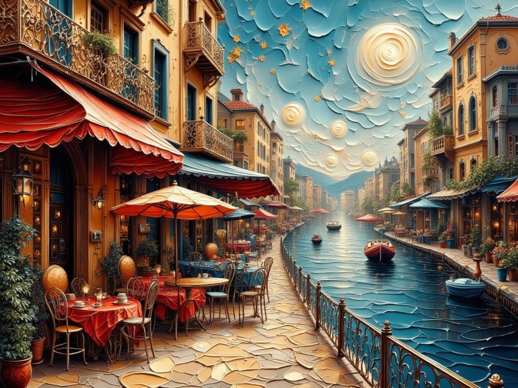 A vivid Italian cafe scene in a layered cityscape under a sunny sky. Features outdoor seating, quilting patterns, and hyper-realistic details with thick impasto brush strokes, as an impasto painting.