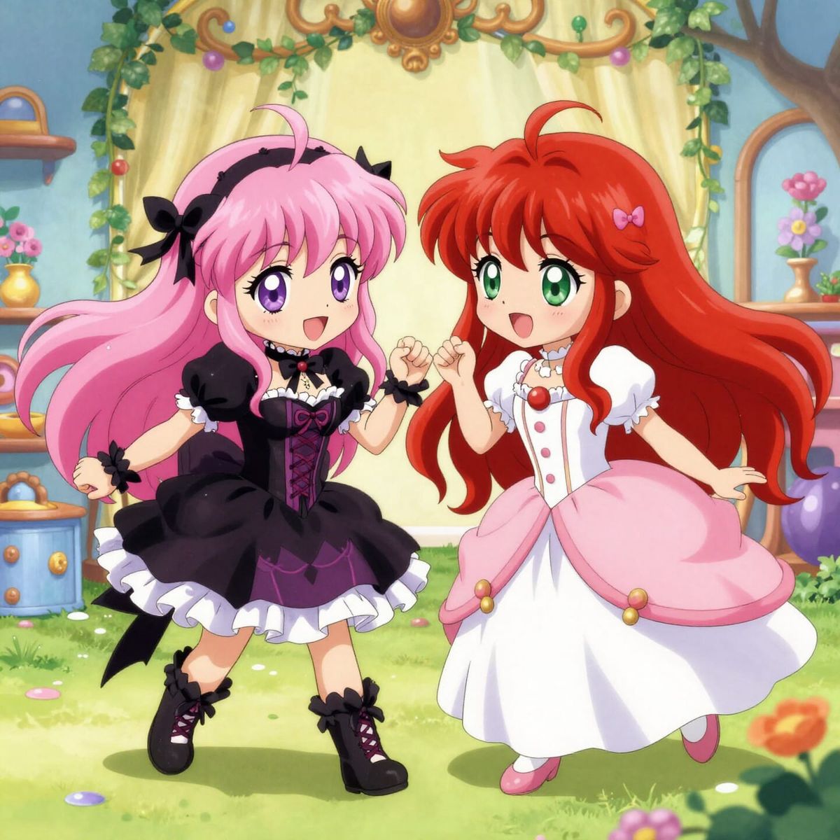This image depicts two adorable Chibi characters, a Gothic woman and a Japanese woman, having fun in a fantastical playroom. Rendered in vibrant manga style with dynamic lighting, it captures a sense of whimsical adventure.