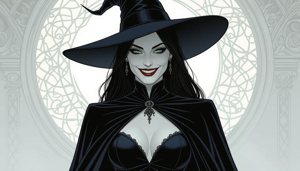 A striking picture of an elegant, sinister woman cloaked in dark velvet, with a knowing smile. The image features highly detailed textures and subtle lighting effects in a dark, mystical setting.