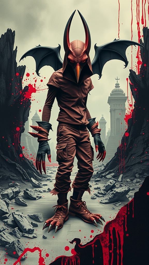 A humanoid Shadow Harpy figure, dressed in tattered matte burgundy janitor uniform