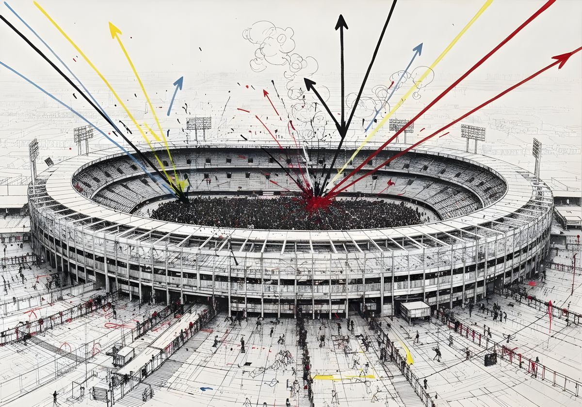 This image displays a monumental landscape painting of a stadium from an elevated view, characterized by explosive gestural energy and dynamic ink and acrylic marks suggesting crowds and movement. The palette is dominated by blacks, grays, and reds, with touches of yellow and blue, evoking urgency.