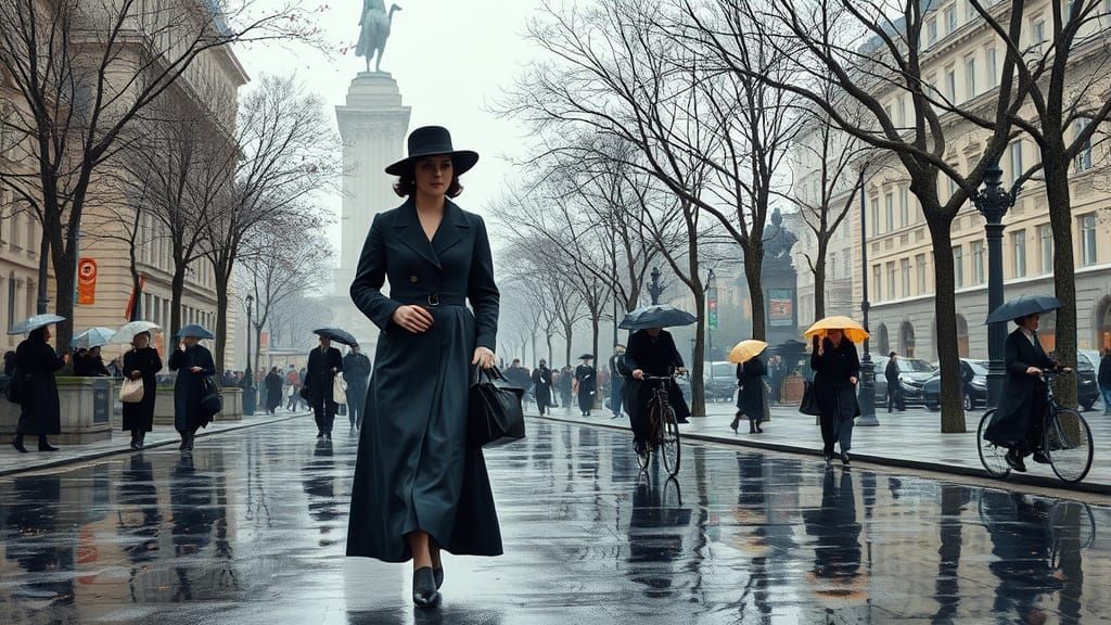 This image captures a lively urban environment on a rainy day, with people in period clothing going about their daily business amidst iconic architecture, bare trees, and scattered autumn leaves, set in a soft, diffused light reminiscent of Impressionist art.