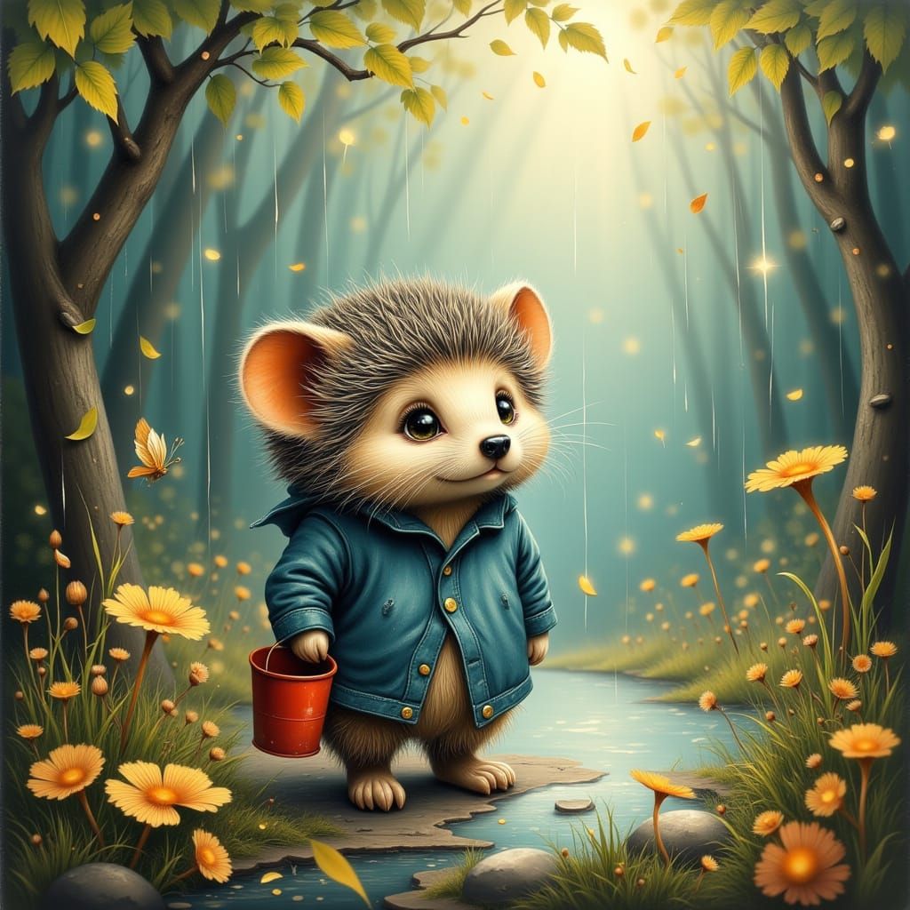 A charming illustration of a hedgehog near a pond in an enchanted forest. The hedgehog wears a blue jacket and sneakers, holding a red bucket. The dreamy scene features soft golden light and storybook textures.