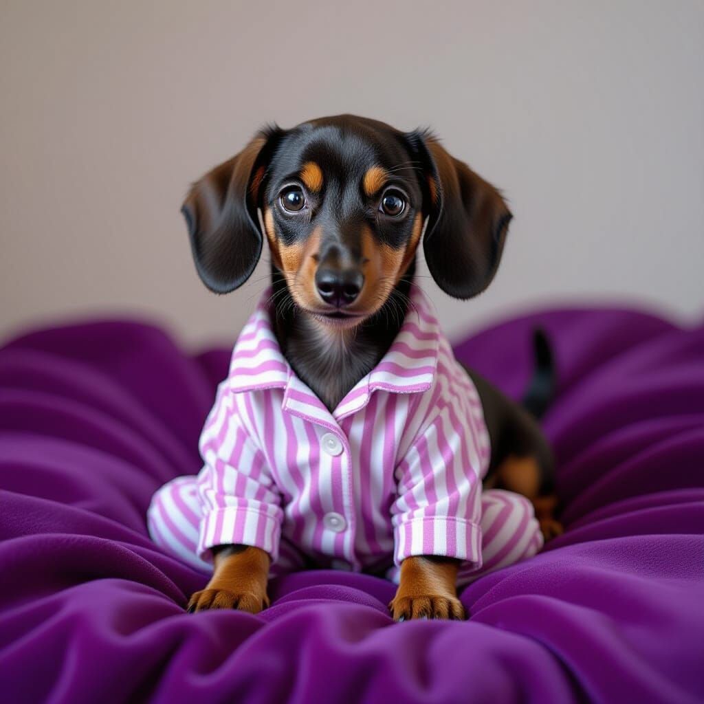 A charming image of a dachshund puppy in pajamas on a velvet blanket. The artwork exhibits whimsical and intricately textured elements with a pastel color palette.