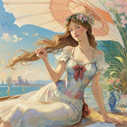 A sunny image of a fox relaxing on a sailboat. The artwork features flowing lines and soft, warm colors in an Art Nouveau style.