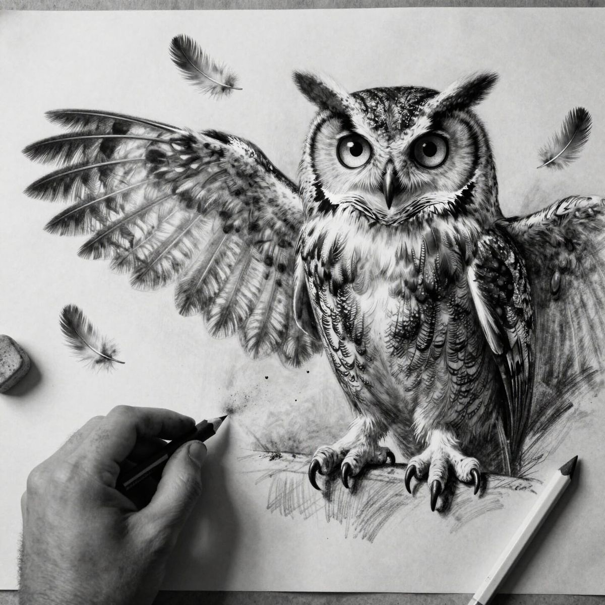 Photorealistic Charcoal Owl Emerges from Drawing Paper