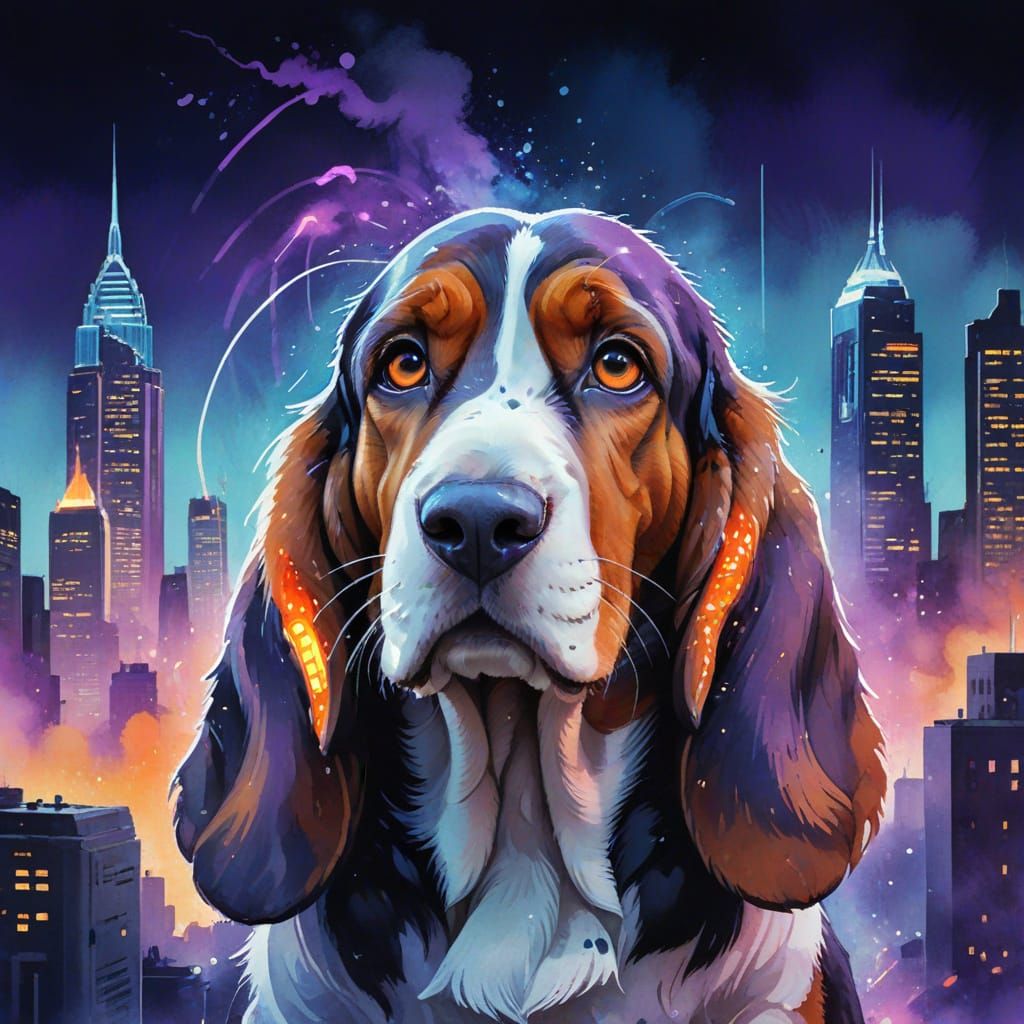 A dramatic watercolor movie poster featuring a half-robotic basset hound with a metallic face and glowing circuits. It holds a cigar with rising smoke against a futuristic city backdrop.
